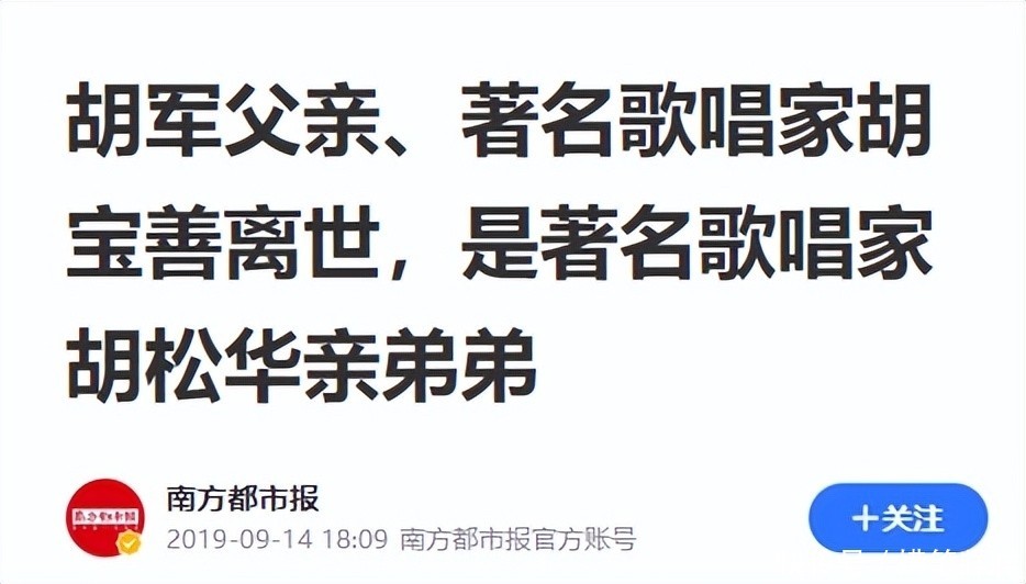 参考资料:南方都市报《胡军父亲、著名歌唱家胡宝善离世,是著名歌唱家胡松华亲弟弟》